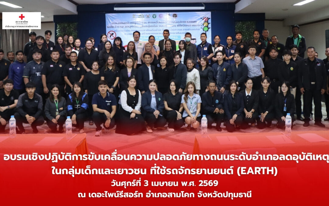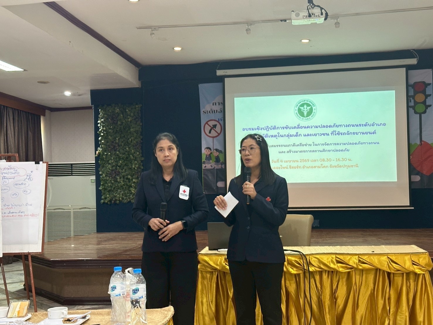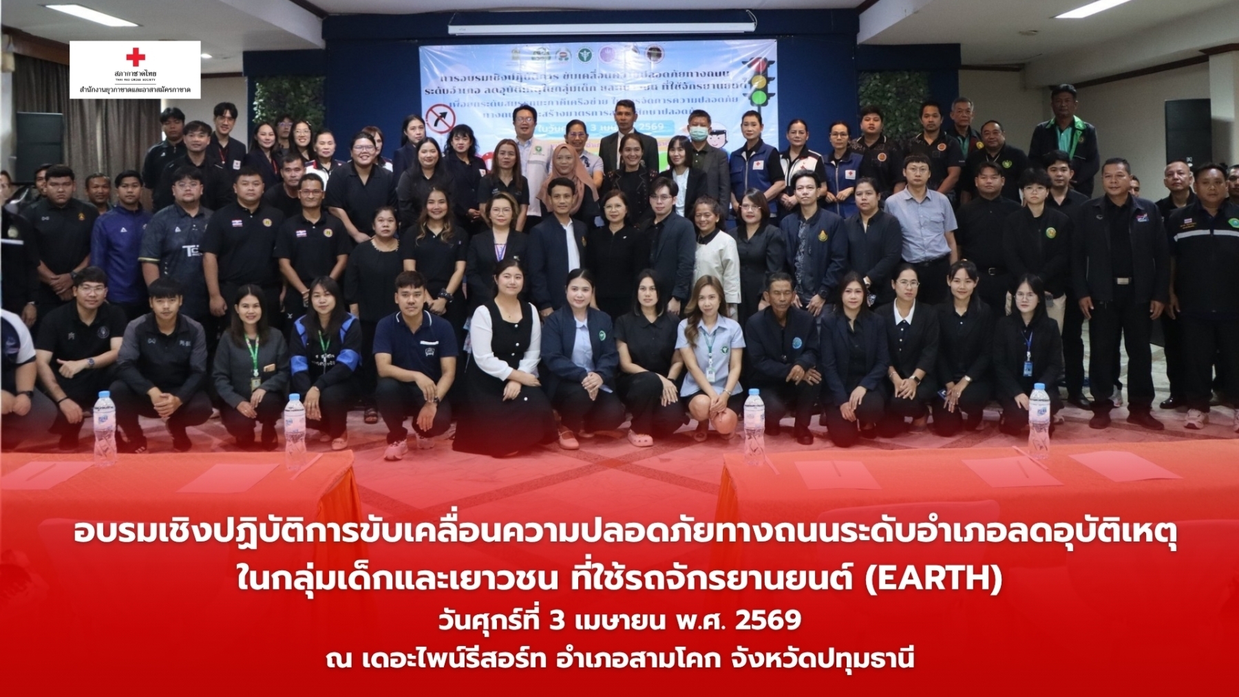 วันศุกร์ที่ 3 เมษายน พ.ศ. 2569 ที่ผ่านมา สำนักงานยุวกาชาดและอาสาสมัครกาชาด ร่วมกับ ศูนย์ฝึกอบรมและปฐมพยาบาล สภากาชาดไทย ได้เข้าร่วม “การอบรมเชิงปฏิบัติการขับเคลื่อนความปลอดภัยทางถนนระดับอำเภอ” ณ เดอะไพน์รีสอร์ท อำเภอสามโคก จังหวัดปทุมธานี ซึ่งจัดขึ้นโดยสำนักงานสาธารณสุขจังหวัดปทุมธานี