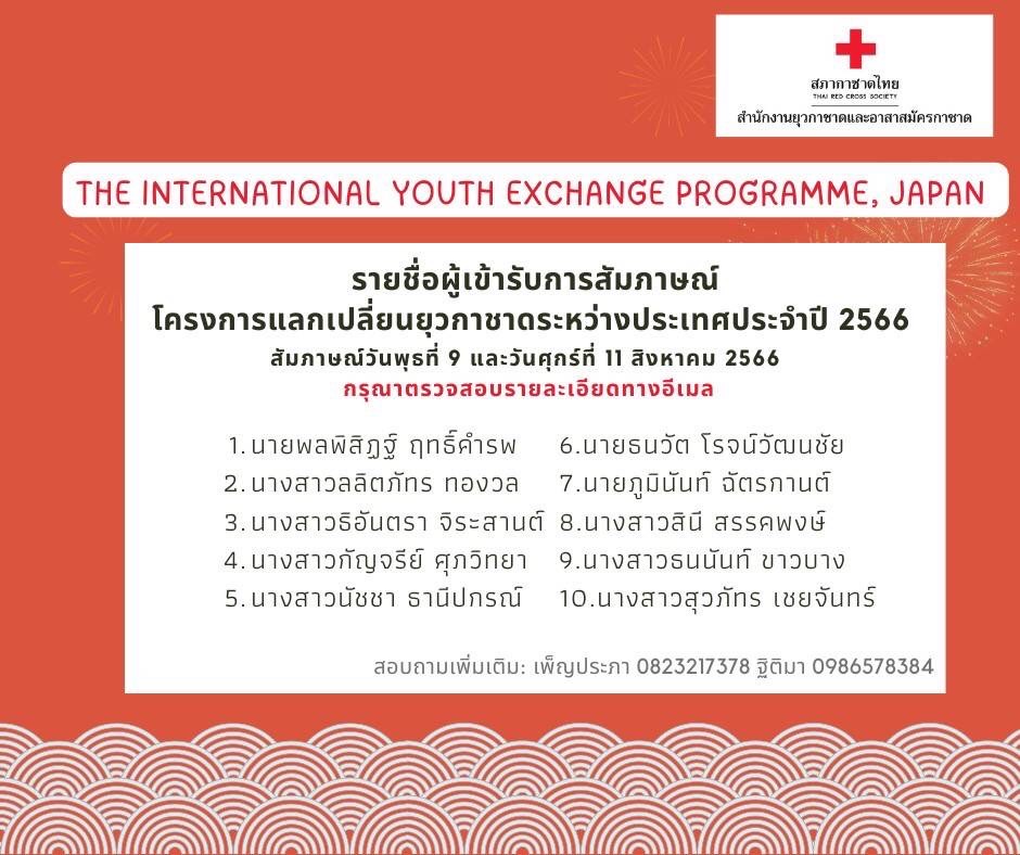 ประกาศรายชื่อผู้มีสิทธิ์เข้ารับการสัมภาษณ์โครงการแลกเปลี่ยนยุวกาชาดระหว่างประเทศประจำปี 2566 by matiporn leetrakul | Aug 7, 2023 | Uncategorized, ข่าว, ข่าวสารกิจกรรม The International Youth Exchange Programme, Japan ประกาศรายชื่อผู้มีสิทธิ์เข้ารับการสัมภาษณ์โครงการแลกเปลี่ยนยุวกาชาดระหว่างประเทศประจำปี 2566 ส่งไปยัง Social Media ของผู้รับชม