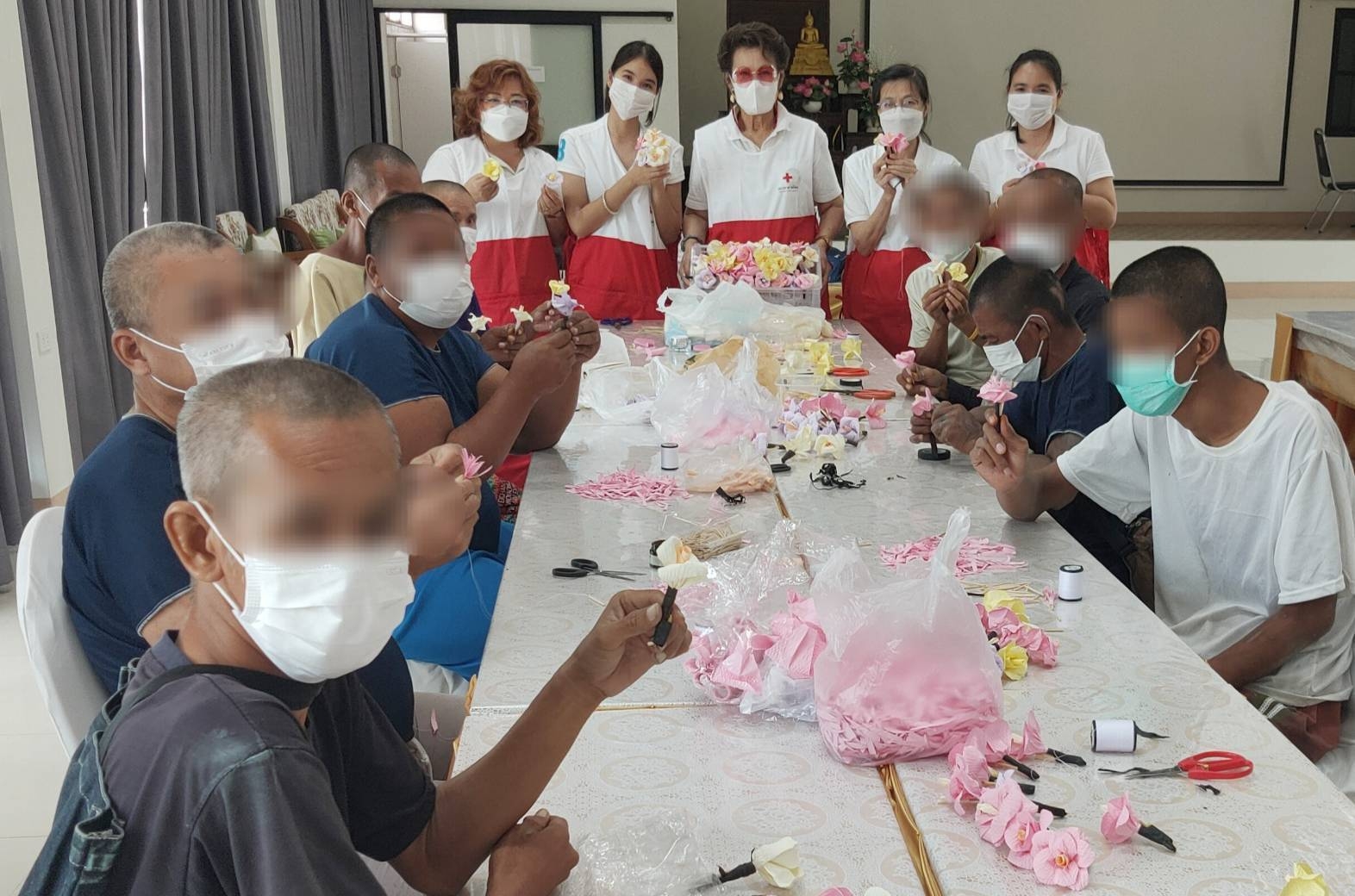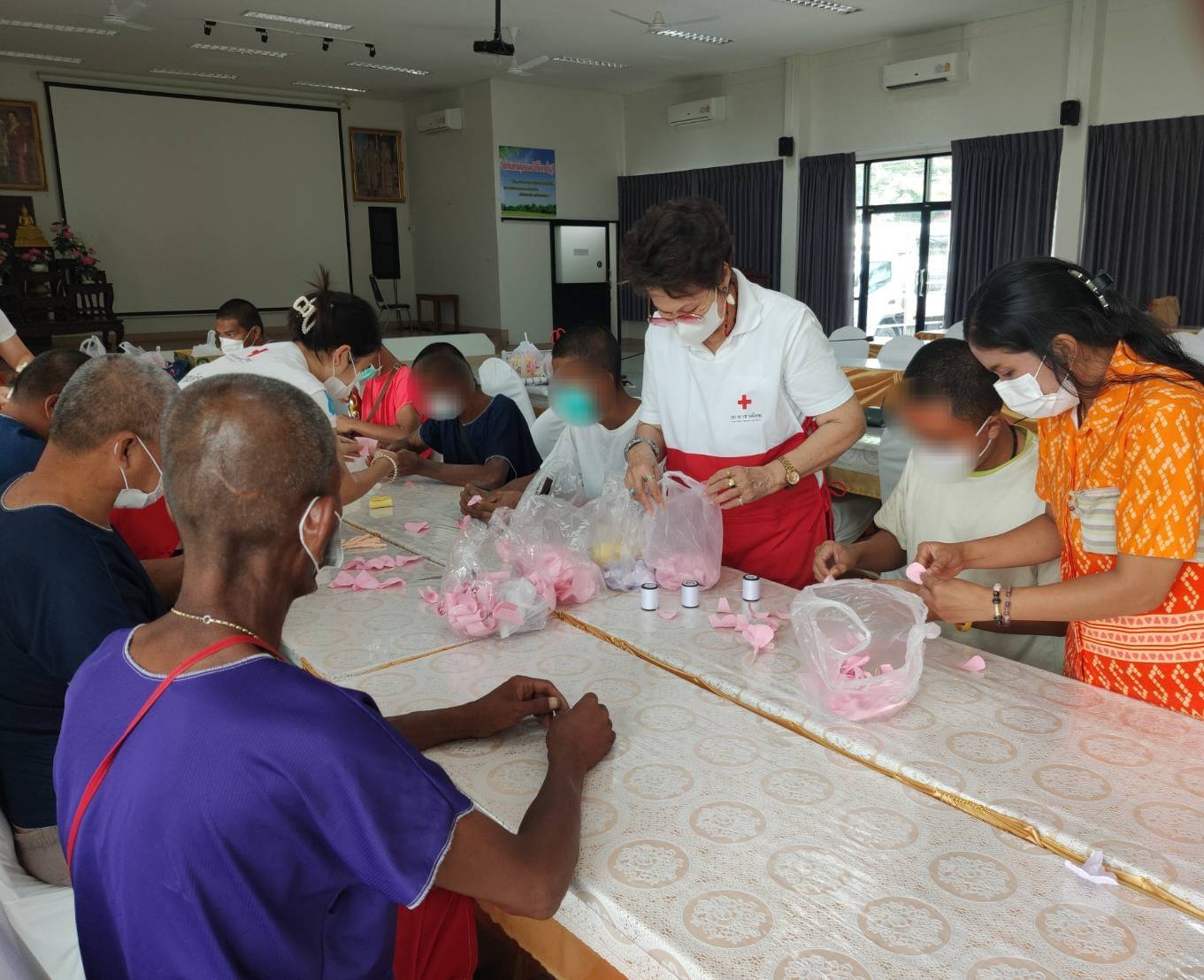 วันที่ 5 ตุลาคม 2566 คณะอาสาสมัครกาชาด “โครงการอาสาสมัครกาชาดร่วมใจพัฒนาชุมชนและสังคม”สาธิตและสอนการทำดอกไม้จันทน์ให้แก่ผู้กลุ่มเปราะบาง เพื่อนำไปใช้ในงานพิธีพระราชทานเพลิงศพผู้อุทิศร่างกายเพื่อการศึกษา (อาจารย์ใหญ่ เป็นกรณีพิเศษ) ประจำปีการศึกษา 2565 ของโรงพยาบาลจุฬาลงกรณ์ และประกอบอาชีพเป็นรายได้เสริม ณ สถานคุ้มครองคนไร้ที่พึ่งชายธัญบุรี จังหวัดปทุมธานี