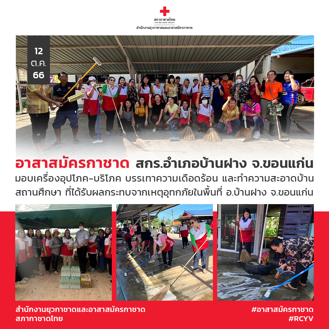 วันที่ 12 ตุลาคม 2566 อาสาสมัครกาชาด สกร.อำเภอบ้านฝาง จังหวัดขอนแก่น จำนวน 39 ลงพื้นที่ช่วยเหลือผู้ประสบอุทกภัย โดยนำเครื่องอุปโภค บริโภค ไปมอบให้เพื่อบรรเทาความเดือดร้อนในเบื้องต้น พร้อมกันนี้ได้นำอาสาสมัครกาชาดทำความสะอาด ฟื้นฟูสภาพแวดล้อมบ้านเรือนประชาชน และสถานศึกษาที่ได้รับผลกระทบจากเหตุอุทกภัย ณ อำเภอบ้านฝาง จังหวัดขอนแก่น