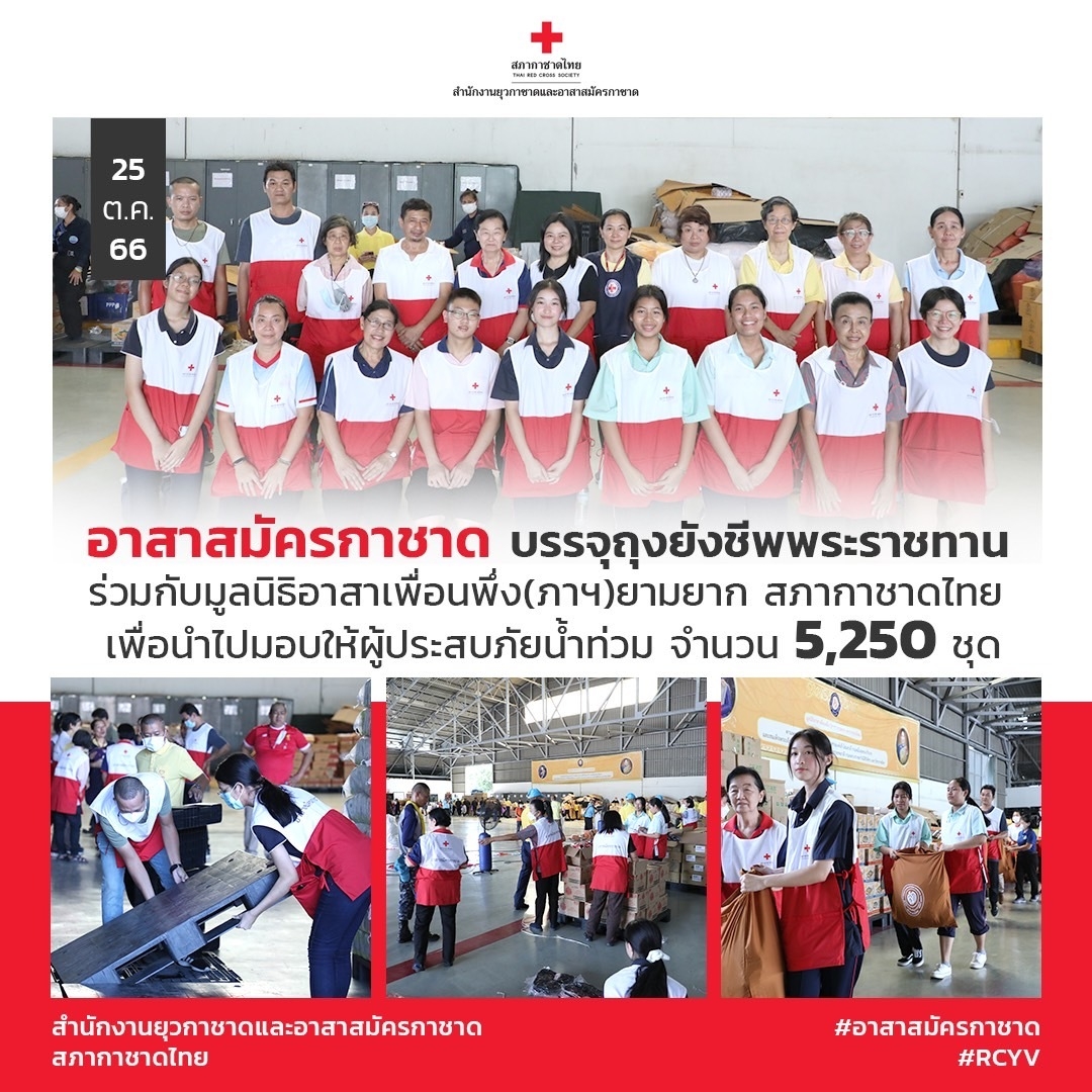 วันที่ 25 ตุลาคม 2566 อาสาภสมัครกาชาด 19 คน บรรจุถุงยังชีพพระราชทาน ร่วมกับมูลนิธิอาสาเพื่อนพึ่ง(ภาฯ) ยามยาก สภากาชาดไทย จำนวน 5,250 ชุด ประกอบด้วย เครื่องอุปโภค บริโภคที่จำเป็นได้แก่ ข้าวสาร อาหารกระป๋อง ยารักษาโรค เพื่อช่วยบรรเทาความเดือดร้อนของประชาชนในพื้นที่ประสบเหตุอุทกภัยในขณะนี้