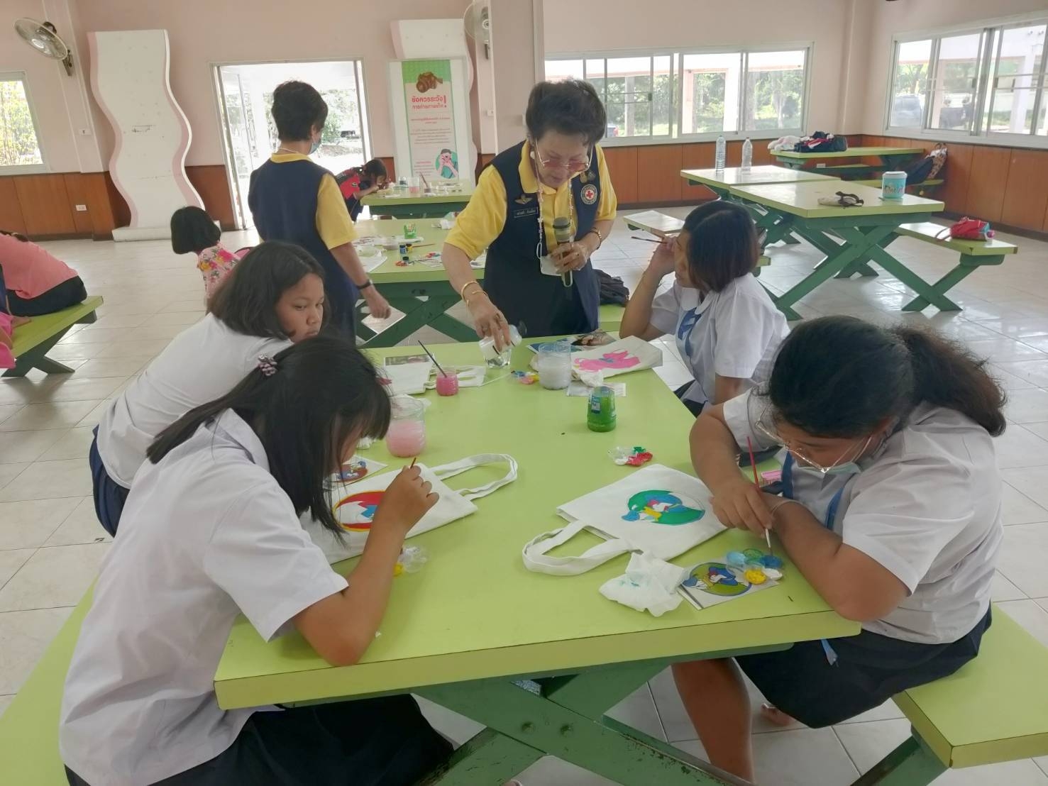 วันที่ 14 พฤษภาคม 2567 อาสาสมัครกาชาด “โครงการอาสาสมัครกาชาดร่วมใจพัฒนาชุมชนและสังคม” พร้อมด้วยเจ้าหน้าที่ฝ่ายพัฒนายุวกาชาดและอาสาสมัครกาชาดจัดกิจกรรมสอนสาธิตการเพ้นท์ถุงผ้าเพื่อใช้สำหรับบรรจุเครื่องเขียน ต้อนรับการเปิดภาคเรียนใหม่ นำไปมอบให้แก่เด็กหญิงจำนวน 42 คน ณ สถานแรกรับเด็กหญิงบ้านธัญญพร อำเภอธัญบุรี จังหวัดปทุมธานี