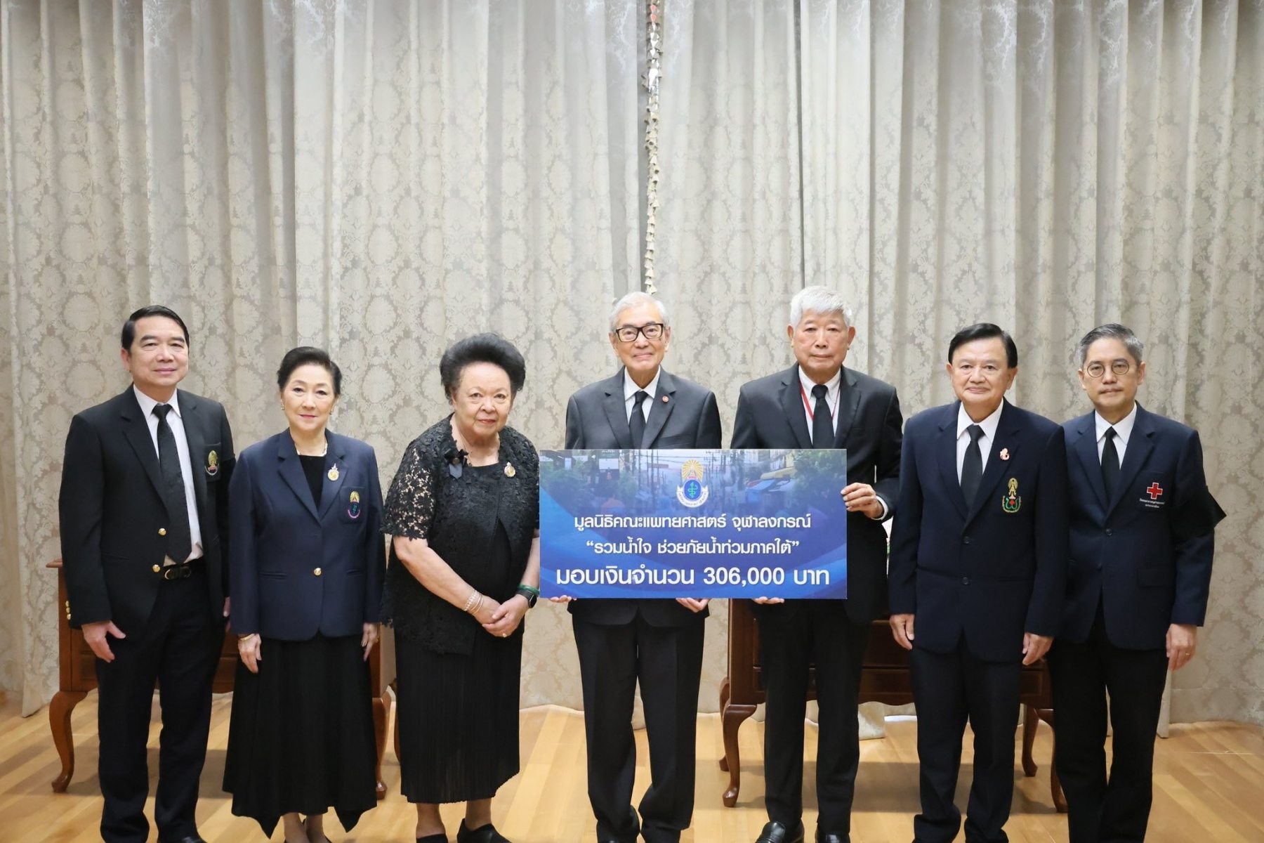วันที่ 4 ธันวาคม 2568 รองศาสตราจารย์ นายแพทย์พินิจ กุลละวณิชย์ ประธานกรรมการมูลนิธิคณะแพทยศาสตร์ จุฬาลงกรณ์พร้อมคณะ มอบเงินจำนวน 306,000 บาท ให้กับนายเตช บุนนาค เลขาธิการสภากาชาดไทย เพื่อนำไปช่วยเหลือผู้ประสบอุทกภัยภาคใต้ ณ อาคารเทิดพระเกียรติสมเด็จพระญาณสังวร (เจริญ สุวฑฺฒโน)