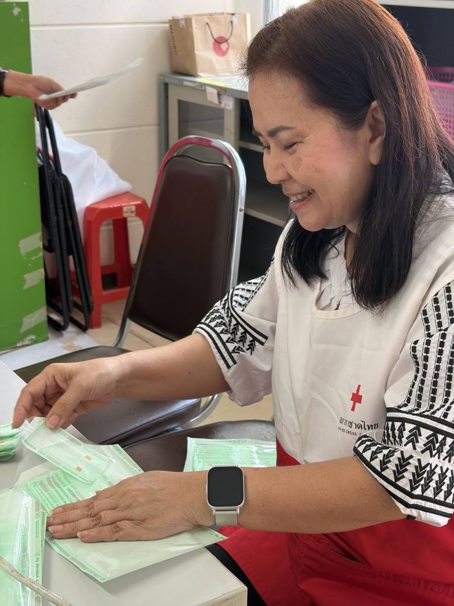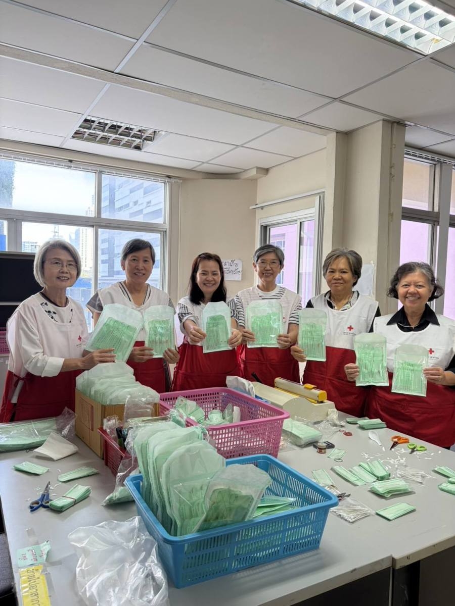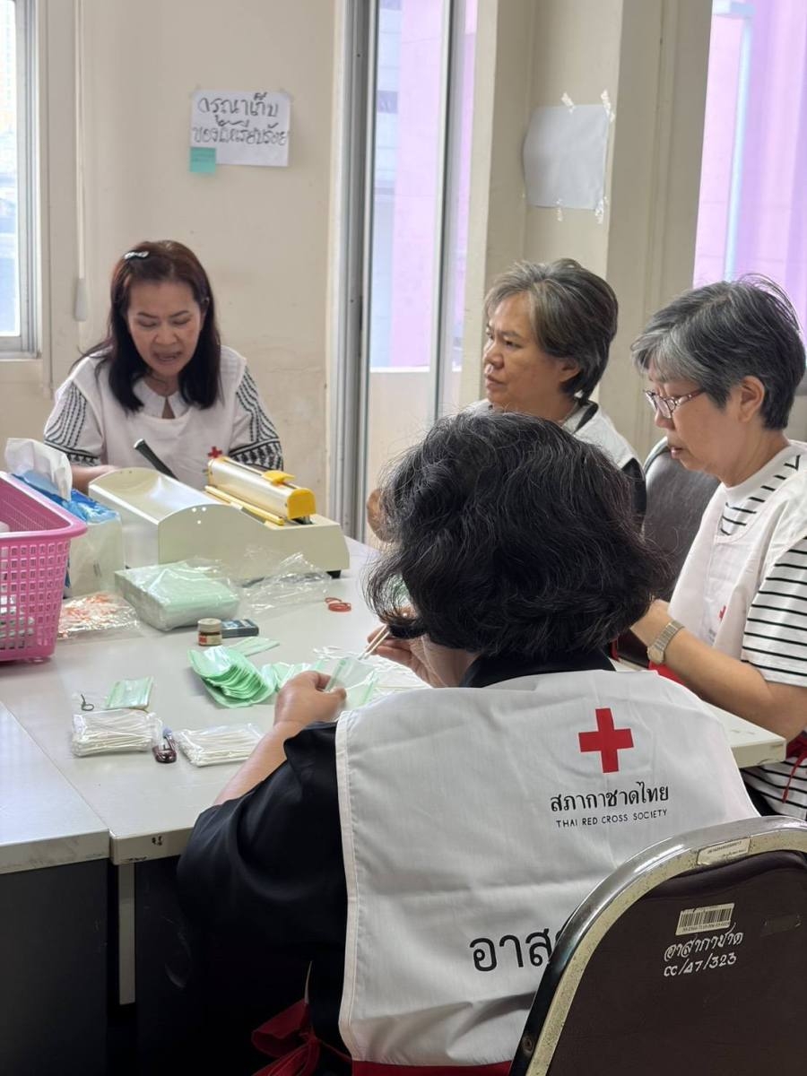 อาสาสมัครกาชาดช่วยปฎิบัติงานผลิตอุปกรณ์สำหรับคลินิกจักษุกรรม โรงพยาบาลจุฬาลงกรณ์ ได้แก่
