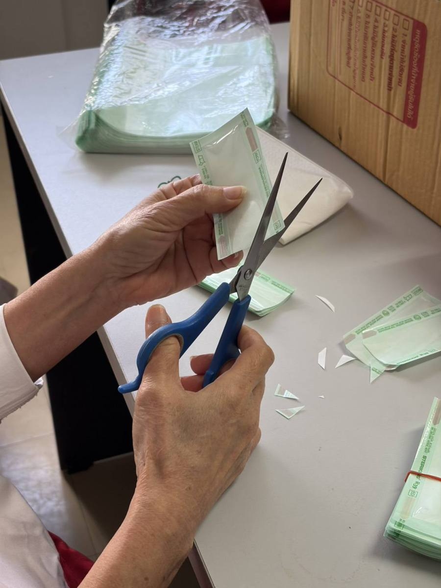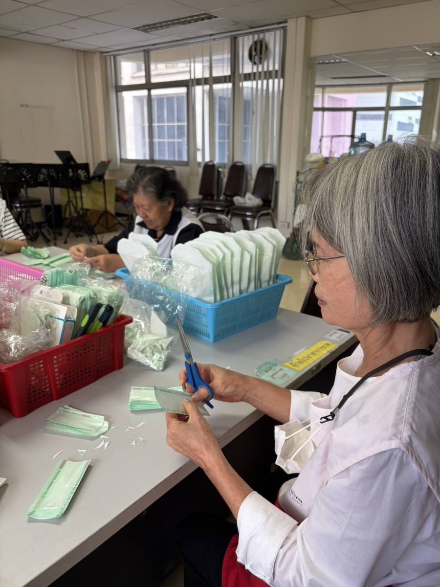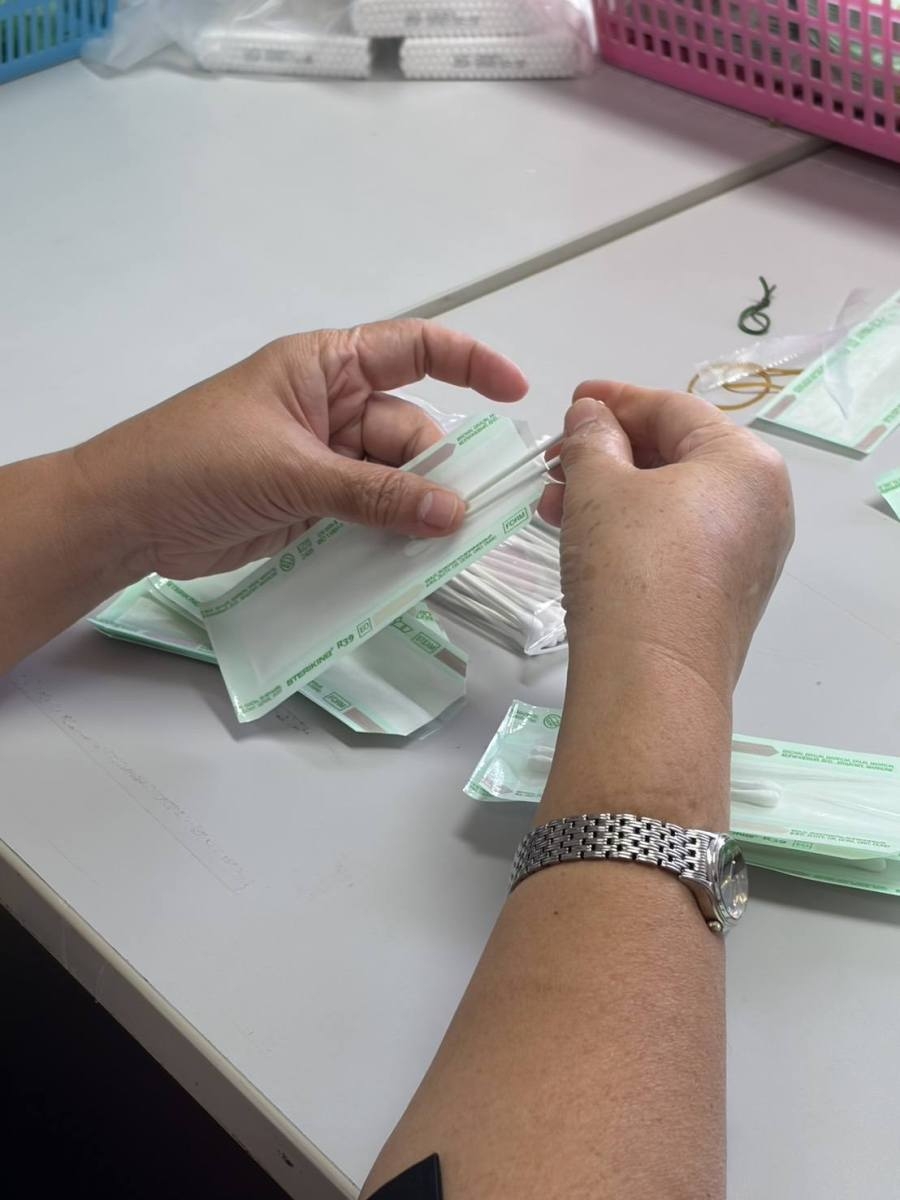 อาสาสมัครกาชาดช่วยปฎิบัติงานผลิตอุปกรณ์สำหรับคลินิกจักษุกรรม โรงพยาบาลจุฬาลงกรณ์ ได้แก่