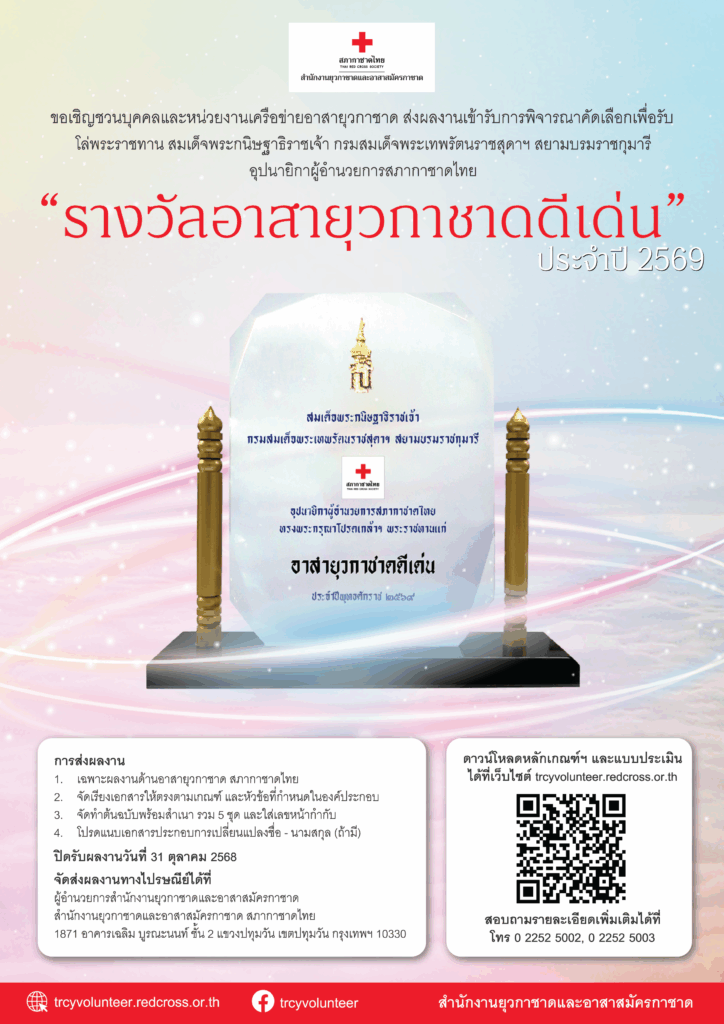 >>ดาวน์โหลดหลักเกณฑ์การคัดเลือกอาสายุวกาชาดดีเด่น (ฉบับแก้ไขเพิ่มเติม พ.ศ.2567)<<