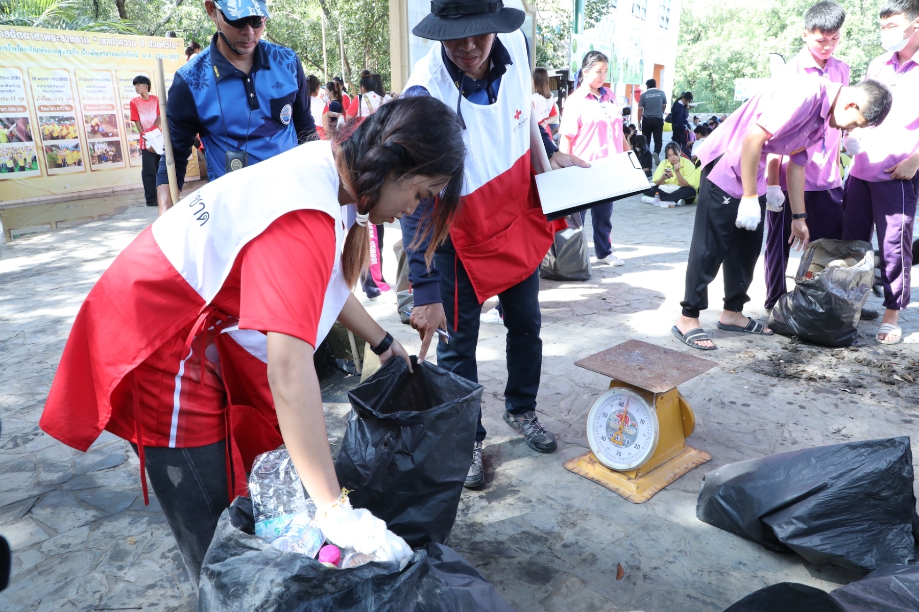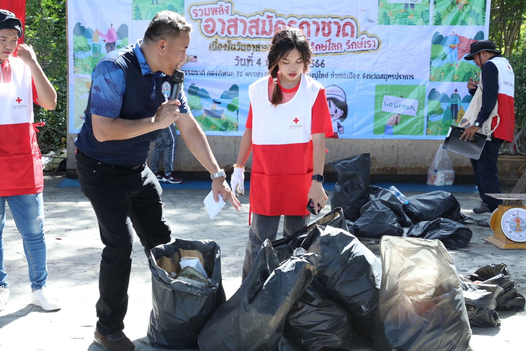 โครงการ “รวมพลังอาสาสมัครกาชาด รักษ์โลก รักษ์เรา” เนื่องในวันอาสาสมัครสากล จัดขึ้นเพื่อมุ่งหวังในการเพิ่มพื้นที่สีเขียว และคงความสมบูรณ์ของพื้นที่ธรรมชาติ อันจะเป็นการส่งเสริมให้อาสาสมัครได้มีส่วนร่วมในการรักษาทรัพยากรธรรมชาติ และสิ่งแวดล้อม นำไปสู่ความยั่งยืน SDGs ต่อไปในอนาคต จึงได้ร่วมกับภาคีเครือข่าย อาทิ ศึกษาธิการจังหวัดสมุทรปราการ สำนักงานทรัพยากรทางทะเลและชายฝั่งที่ 2 จังหวัดสมุทรปราการ เทศบาลตำบลบางปู อาสาสมัครกาชาด พร้อมด้วยเจ้าหน้าที่จากกองสถานพักผ่อน กรมพลาธิการทหารบก ร่วมกันเก็บขยะตลอดแนวชายฝั่ง ระยะทาง 3 กิโลเมตร โดยสามารถเก็บขยะทะเล และขยะตกค้างในระบบนิเวศได้ทั้งสิ้น จำนวน 1,040 กิโลกรัม จำแนกเป็นขยะพลาสติก และลำไม้ไผ่ มากเป็นอันดับต้น โดยขยะที่อาสาสมัครร่วมกันเก็บขึ้นมานั้น จะถูกนำไปคัดแยกประเภทขยะตามมาตรฐาน ICC โดยสำนักงานทรัพยากรทางทะเลและชายฝั่งที่ 2 จังหวัดสมุทรปราการ และจะนำไปทำลายตามกระบวนการที่ถูกต้องต่อไป ทั้งนี้ได้รับความสนับสนุนการขนย้ายขยะจากเทศบาลตำบลบางปู จังหวัดสมุทรปราการ